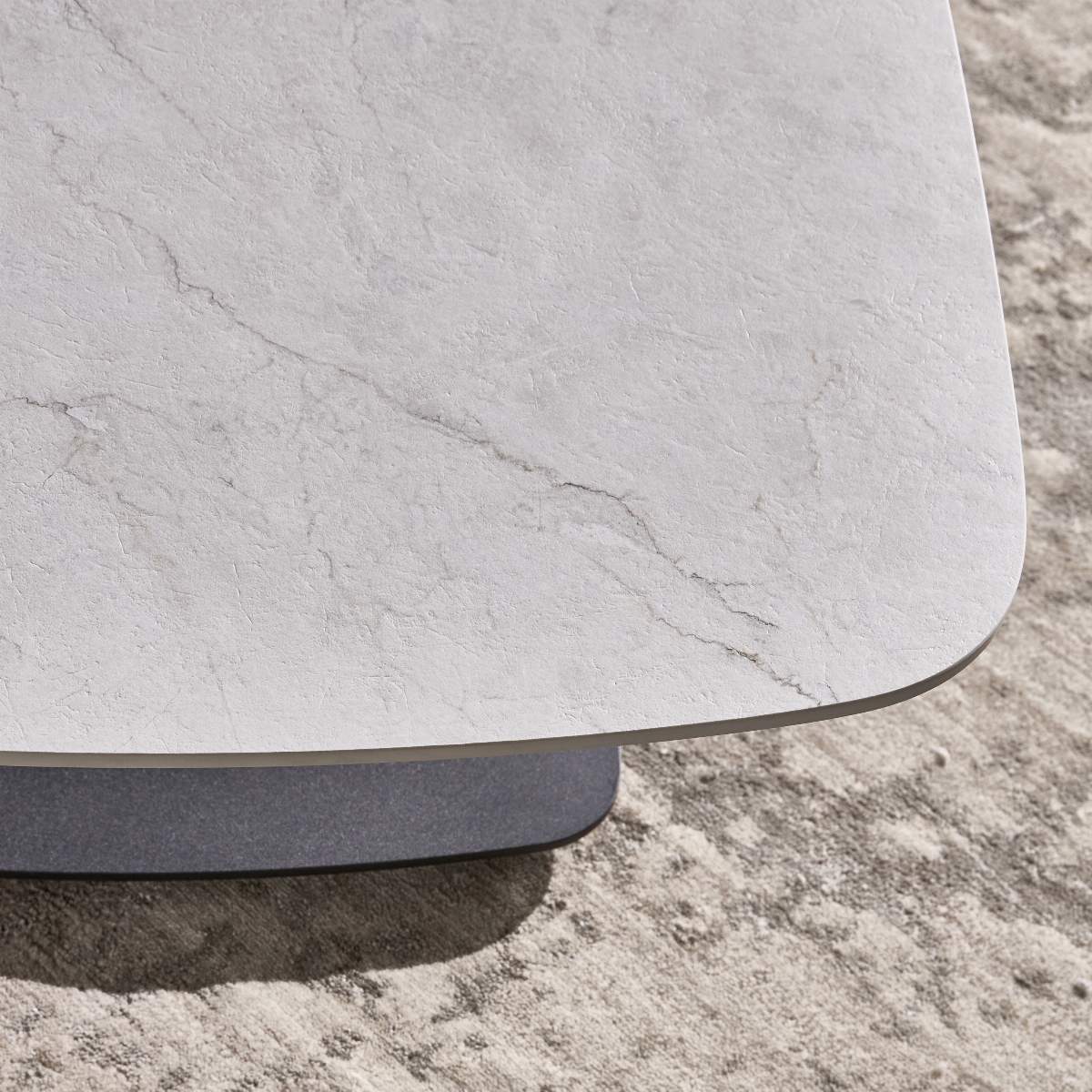Details: Abmessungen Tischplatte Keramik Marble Mist, Gestell Metall schwarz matt, höhenverstellbar mit Fußpedal