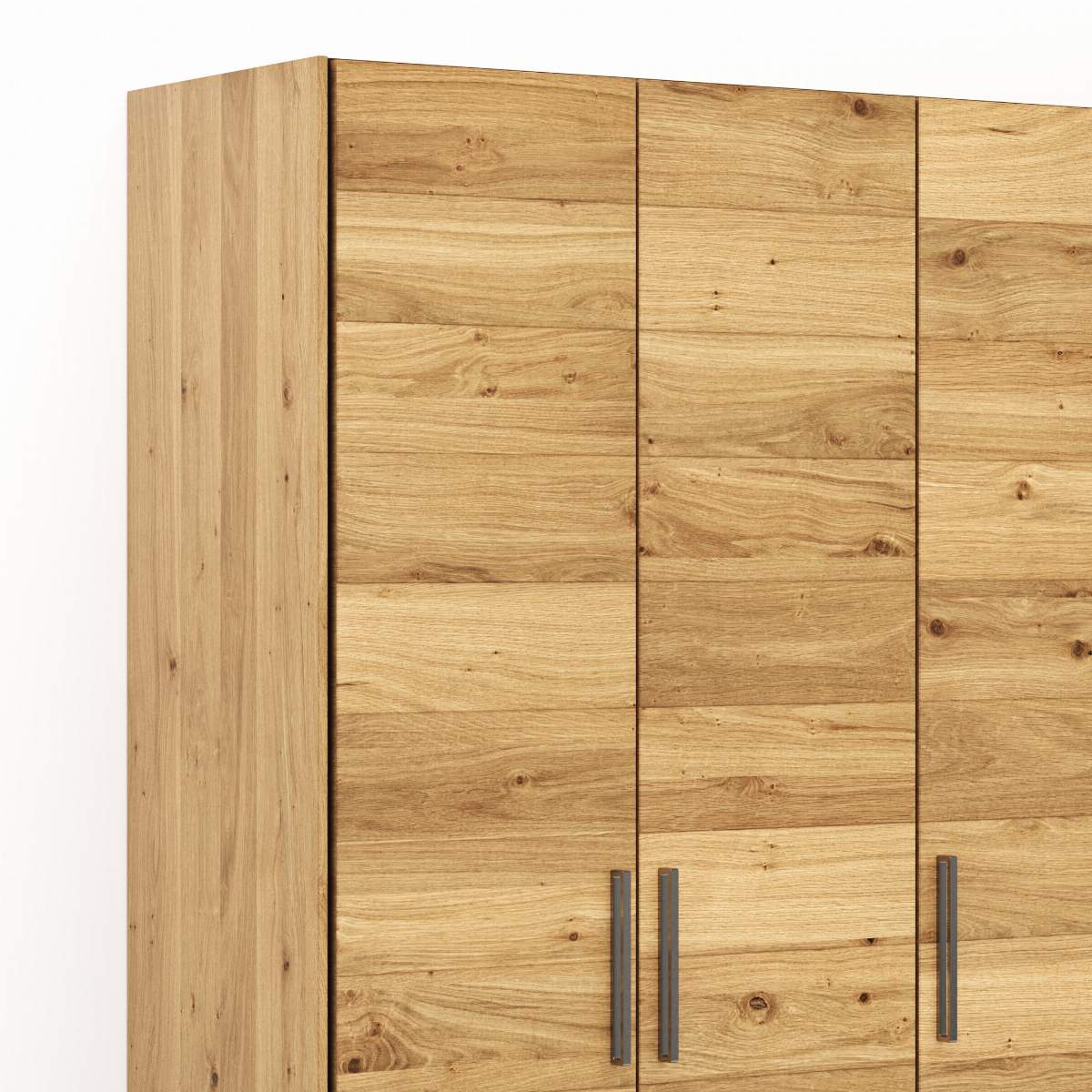 Details: Abmessungen Front: Wildeichenfurnier natur BretteroptikKorpus: Novaschwarz mit Abschlussseiten Eichenfurnier naturGriffe: Bügelgriffe titanfarbig matt, L ca. 28 cm5-türiginkl. 1 Kleiderstange und 1 Einlegeboden pro Abteil