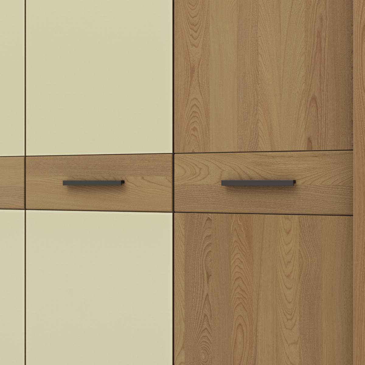 Details: Abmessungen Drehtürenschrank mit 2 Holztüren außen und 3 Glastüren innenincl. Querriegel Eiche massiv, schlichtAusführung Korpus: 221Ausführung Holztüren: Eiche massiv geöltAusführung Glastüren: ChampagnerfarbenGriffe: Metall, schieferfarben