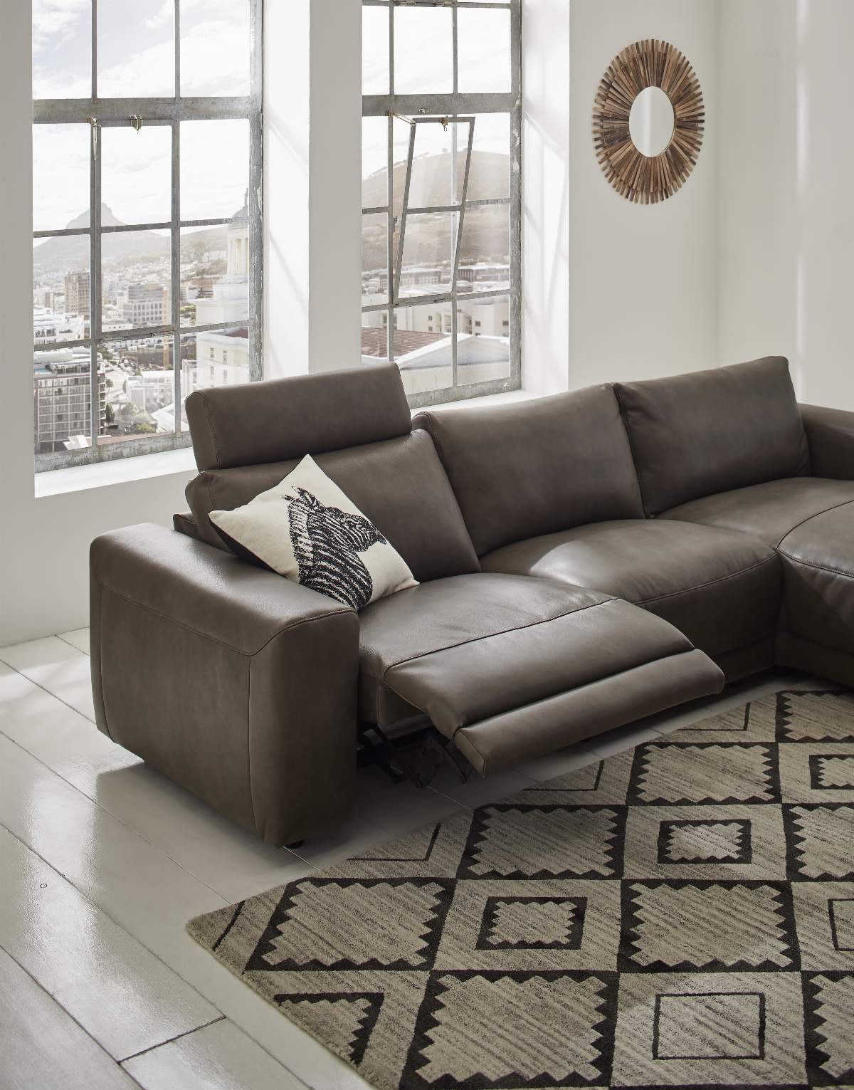 Details: Abmessungen Bezug: Leder WL chocolate, PG. L30, bestehend aus: 1,25-Sitzer Armlehne links mit motorischer Relaxfunktion inkl. Kopfstütze mit Rastomat, 1,25 ohne Armlehne, Longchair groß Armlehne rechts, Füße: Kunststoff H-5cm