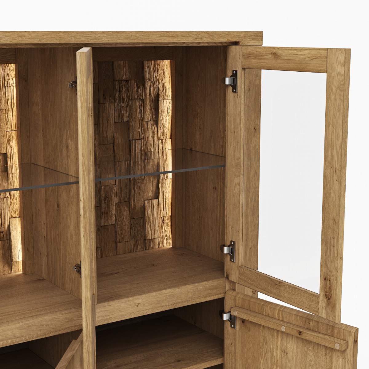 Highboard Bakersfield - inkl. Beleuchtung, Rückwand mit Holzschindeln, Asteiche massiv, geölt