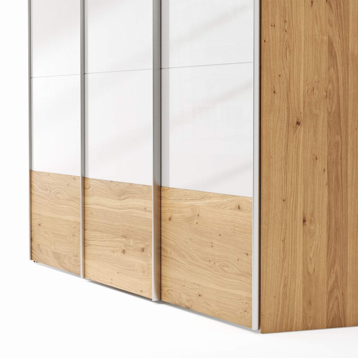 - Der Natura Home Schwebetürenschrank Colorado besticht durch seinen Korpus in Premiumweiß, kombiniert mit Abschlussseiten aus Eichenfurnier. Die Front setzt sich aus Eichefurnier, kombiniert mit weißem Glas, zusammen. Mit einer Höhe von ca. 236 cm und einer Tiefe von ca. 65 cm bietet der Schrank großzügigen Stauraum. Die drei Türen sind mit einer praktischen Dämpfung ausgestattet, die für ein sanftes und leises Schließen sorgt. Die Griffleisten in Edelstahoptik betonen das moderne Design und fügen sich harmonisch in jedes Schlafzimmer ein.