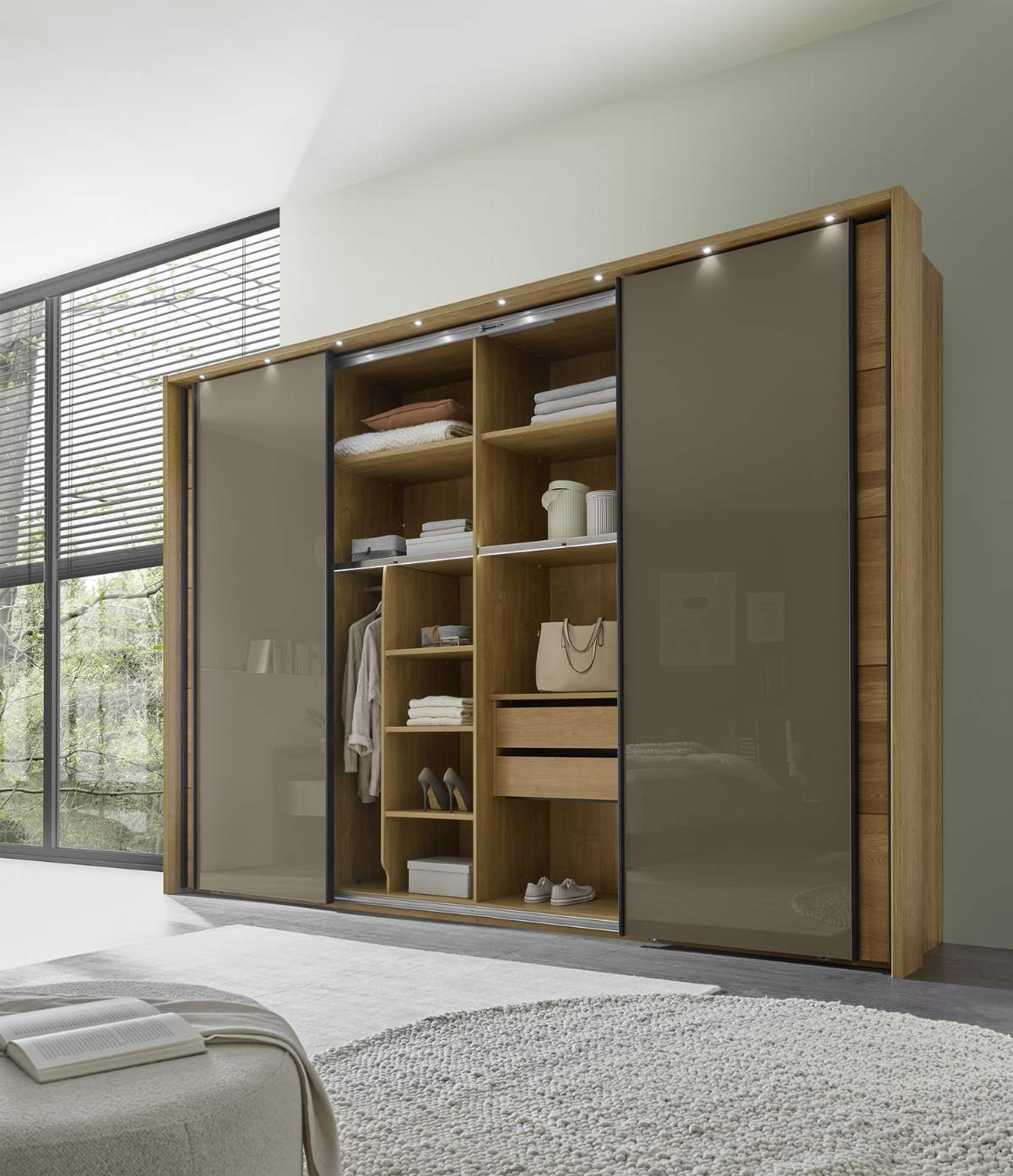 Schwebetürenschrank Lenoso - B. ca. 340 cm, Eiche massiv, Glas, Graubraun
