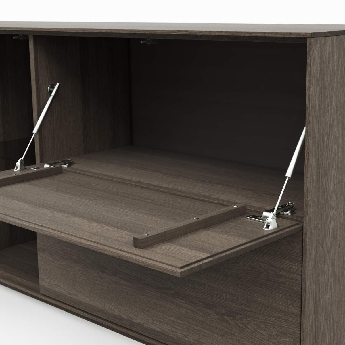 Details: Abmessungen 2x Klapptüren, 2 Holztüren, 1 Glastüre1 Glasfachboden, 1 HolzfachbodenLinke Tür u. Klapptüren mit ""push door open""