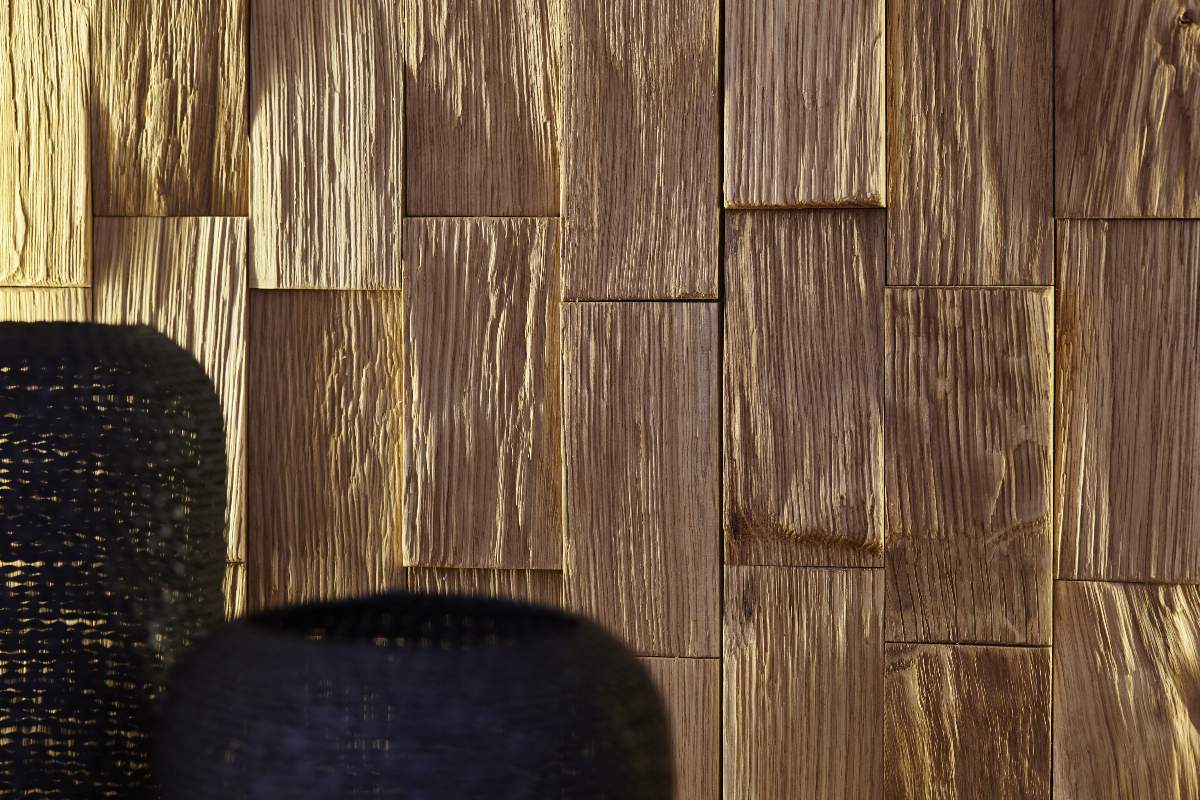 Wohnwand Bakersfield - inkl. Beleuchtung, sichtbare Rückwände mit Holzschindeln/Schubladenfront mit Schroppung, Asteiche massiv, geölt