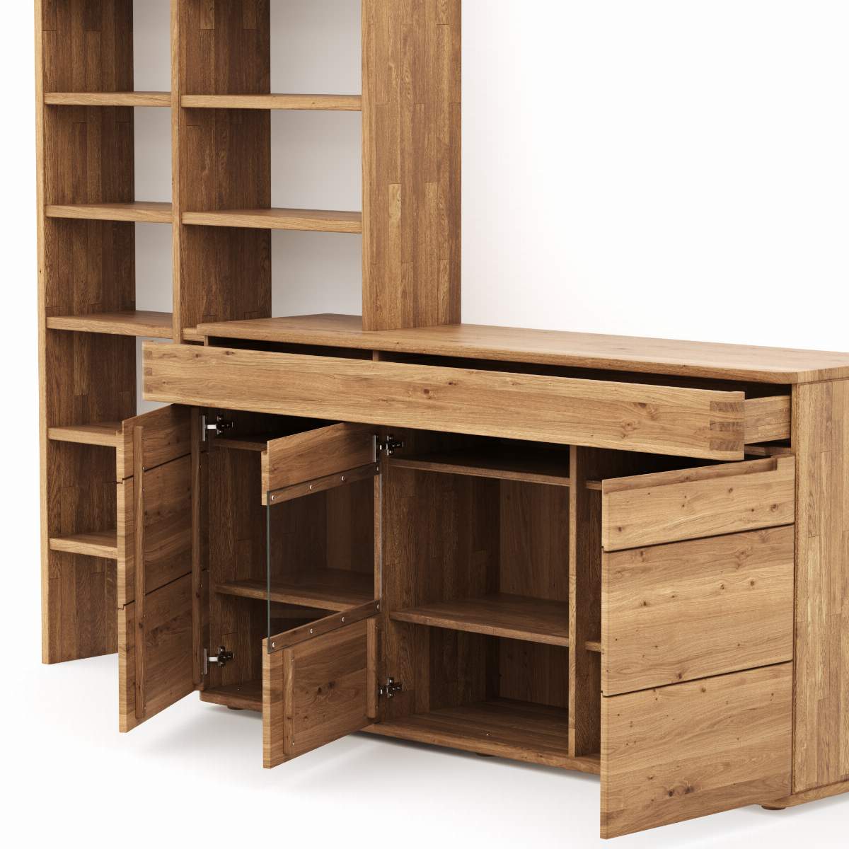 Details: Abmessungen Korpus: Wildeiche massiv, natur geölt; Front: Wildeiche massiv, natur geöltRückwand Sideboard im Sichtbereich: Sperrholz (Natur, Standard)Regal: Wildeiche massiv, natur geöltV16702 bestehend aus:1 x Außenstollen links 1678501 x Mittelstollen 1678511 x Aufsatzstollen rechts 1678557 x Einhängeboden 1677013 x Einhängeboden 1677004 x Einhängeboden 1677021 x Sideboard 167101